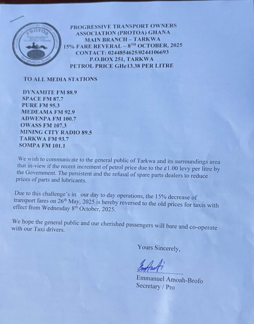 Transport fares in Tarkwa are set to go up again, as the Progressive Transport Owners Association (PROTOA) Tarkwa branch has announced a reversal of the 15% fare reduction implemented earlier this year.