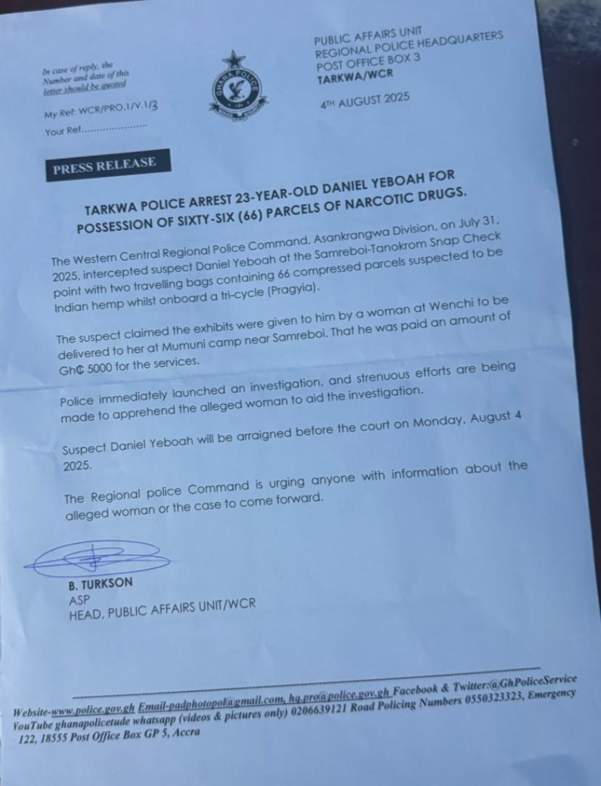 Tarkwa Police Arrest 23-Year-Old with 66 Parcels of Suspected Narcotics